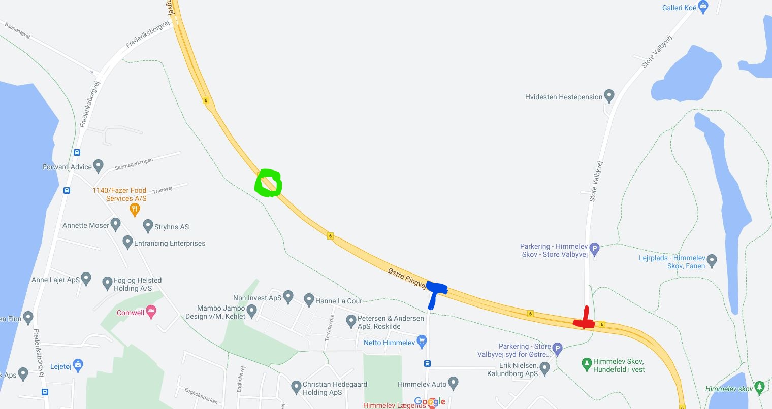 Øster Ringvej (rute 6) nord for Himmelev er gennem de sidste mange år (19) blevet mere og mere belaster af øget trafik mængde og tungere trafik. I april 2012 åbnede Netto en butik på Himmelev Bygade 61. Denne butik er særdeles populær og har med sin placering medført øget trafik i området. Inden Coronapandemien blev der hver torsdag i sommerperioden afholdt stort bil/motorcykel træf på Havnen i Roskilde. Hver torsdag aften når træffet er slut er der voldsom trafik på Øster Ringvej hvor både biler og i særdeleshed motorcykler kører med alt for høj fart på strækningen fra trafikkrydset ved Frederiksborgvej og op ad Øster Ringvej mod Roskilde øst. Dette med store støjmæssige gener for beboerne i området som grænser op til Ringvejen. Dagligt er der problemer for rutebusser der har svært ved at komme ud på Øster Ringvej i krydset ved Himmelev Bygade/Øster Ringvej. Det samme gør sig gældende et par 100 meter længere oppe ved krydset Store Valbyvej/Øster Ringvej. Mit forslag er at der etableres to nye lyskryds og en ny rundkørsel på strækningen (se vedhæftet fil). Lyskryds 1 (rød på kortet) placeres i krydset Store Valbyvej/Øster Ringvej. Lyskryds 2 (blå på kortet) placeres i krydset Himmelev Bygade/Øster Ringvej. Ny rundkørsel (grøn på kortet) placeres på strækningen lige imellem det eksisterende lyskryds Frederiksborgvej/ Øster Ringvej og det nye Lyskryds 2. Længere nord på ad rute 6 er der placeret flere rundkørsler som hjælper med bænkning af hastigheden på ruten. Jeg håber der vil være opbakning til mit forslag da jeg mener det vil bidrage til en mere stille og bedre afvikling af trafikken rundt nord om Roskilde. Specielt støjgenerne bør der være langt mere fokus på at få fjernet. Venlig hilsen Chris Jenkins