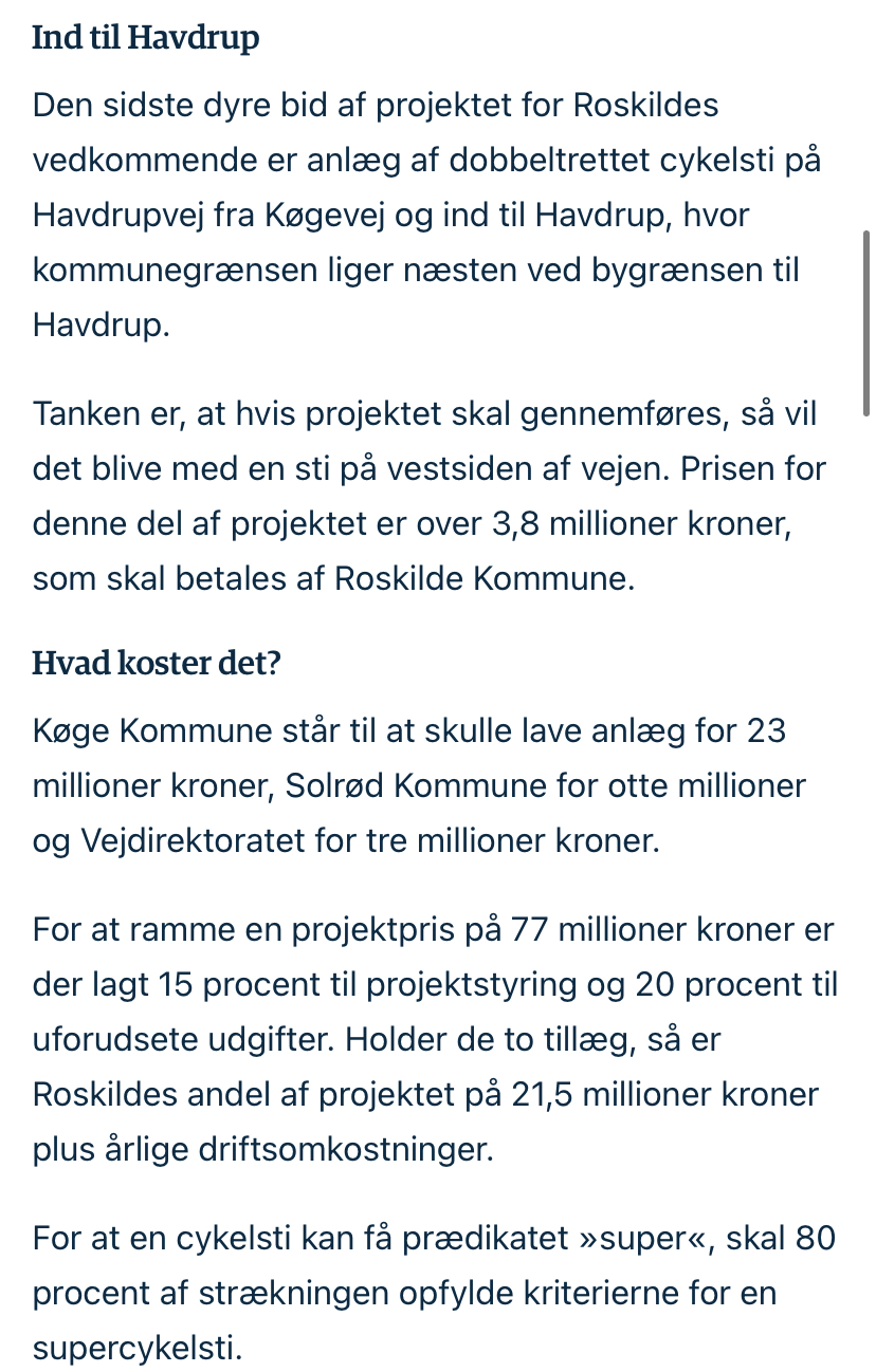 Det er ved at være en nødvendighed at man snart overvejer at etablere en cykelsti på Havdrupvejen mellem Køgevejen og Havdrup. Både for cykelister og fodgængere er færden på Havdrupvejen livsfarlig. Dette gør også at folk bevist undgår at tage cyklen eller gå en tur ud i naturen. Det er på tide man handler her. Før det kommer til at koste menneskeliv. Også er der også lavet en beregning vedr. omkostninger til etableringen af denne strækning på beskedne 3,8 mio kr. Dette vurderes at være en billig investering i forhold til hvor meget gavn den vil kunne bidrage med for flere tusind mennesker. Sikkerheden ville bliver markant forbedret og ligeledes vil dette gøre at flere ville kunne tage deres cykel på arbejde eller udflugter til Roskilde eller Køge for den sags skyld. Men dette ville også gør livet nemmere for bilisterne på Havdrupvejen, da der på nuværende tidspunkt dagligt sker farlige situationer, som skyldes at der simpelthen ikke er plads nok til at kunne foretage en sikker overhaling af en cyklist eller fodgænger. Dette skyldes vejens forløb med mange blive vinkler og bakker, samt udkørseler til Havdrupvejen. Så ROSKILDE KOMMUNE vil i ikke nok gøre alvor af tingene og prioriter sikkerhed og grøn omstilling. Inden det kommer til at koste en uskyldig person livet.