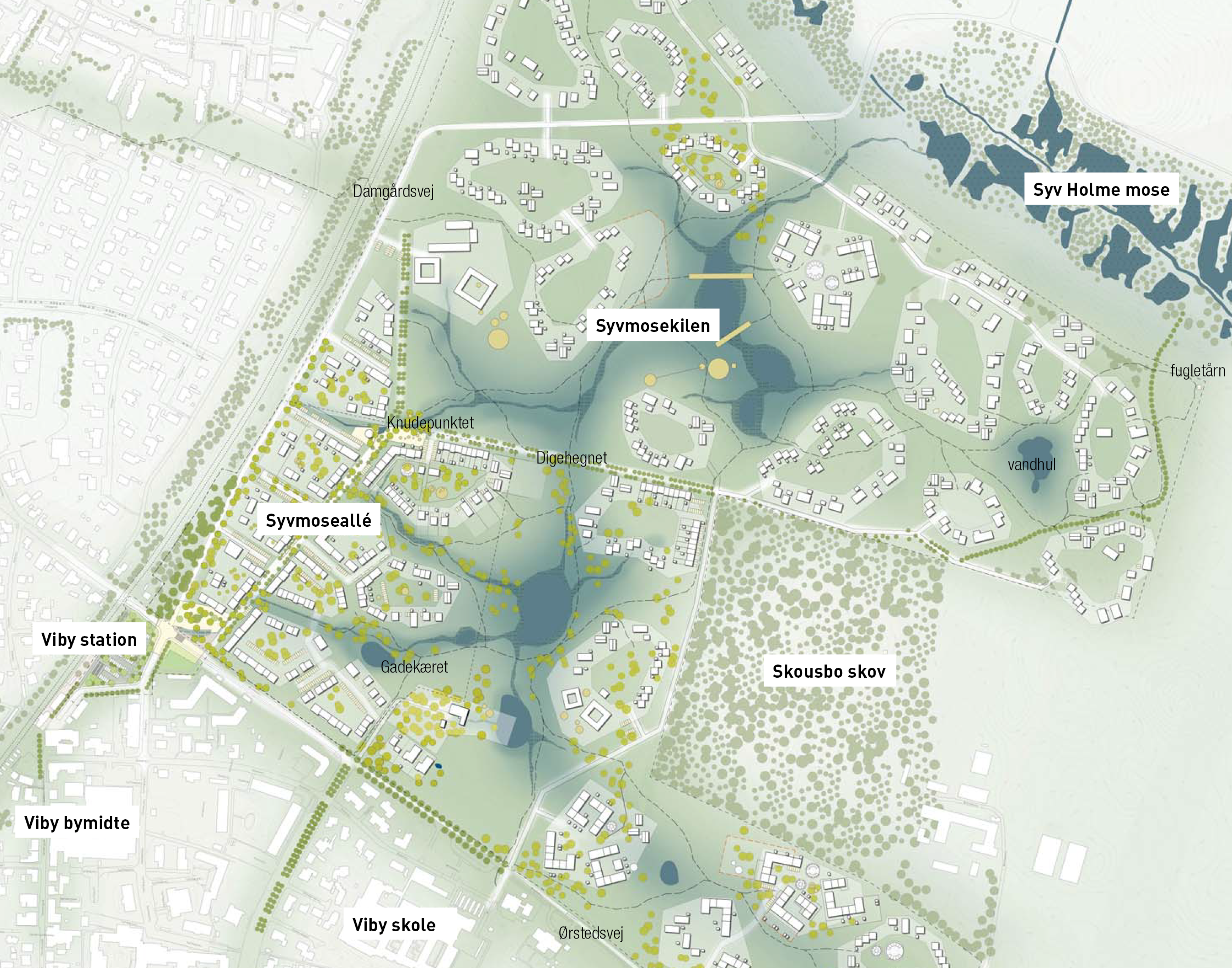 Skousbo bliver en moderne bydel i Viby med plads til fællesskaber og udfoldelsesmuligheder både i forhold til naboer og til landskabet.
