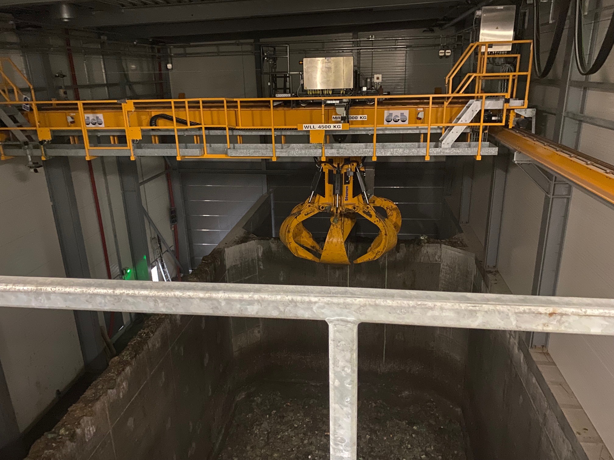 I aflæsserbygningen fordeler kranen madaffaldet i de forskellige siloer. I siloen til venstre lastes alt madaffaldet, der skal til Gemidan.