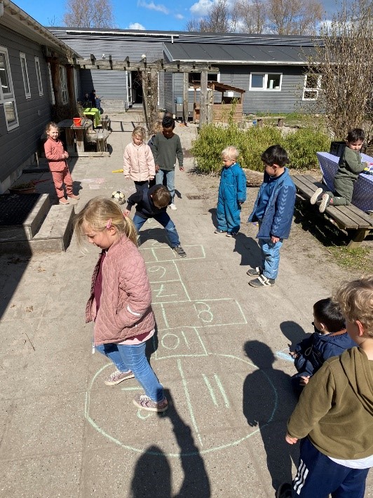Vi har byens bedste legeplads, der tilbyder mange forskellige udviklingsmuligheder med grønne træer og buske, der skaber rum, hvor børn kan lege uforstyrret, bålhytte, hvor vi varmer os, når det er koldt og bålplads, hvor vi sammen laver mad. Vi hjælper hinanden med at passe på vores legeplads og inddrager børnene i, hvordan vi passer på træer, blomster og græs.