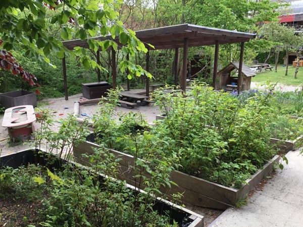Vi har en fantastisk kuperet legeplads med masser af plads og en bjælkehytte, udeværksted, plantekasser til krydderurter, blomster, insekthotel, forskellige gynger, klatrestativ, cykelbane, bålhytte, fodboldbane, klatreskrænt, rutchebaner samt mange kroge og buske man kan gemme sig i.
